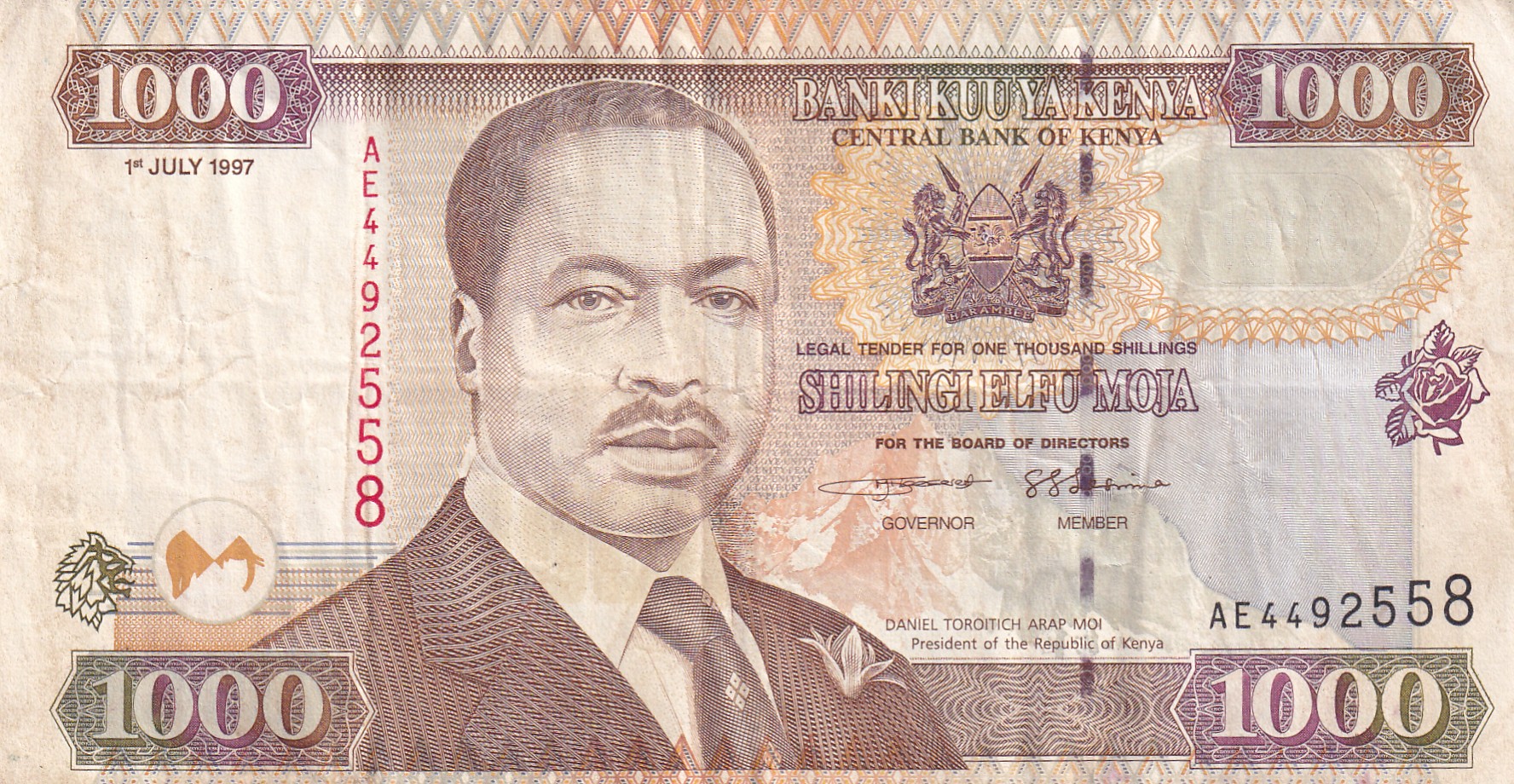 Front facing bust of President Daniel Toroitich Arap Moi and arms at centre, mountain at lower centre, rose at right. Segmented foil over security thread
