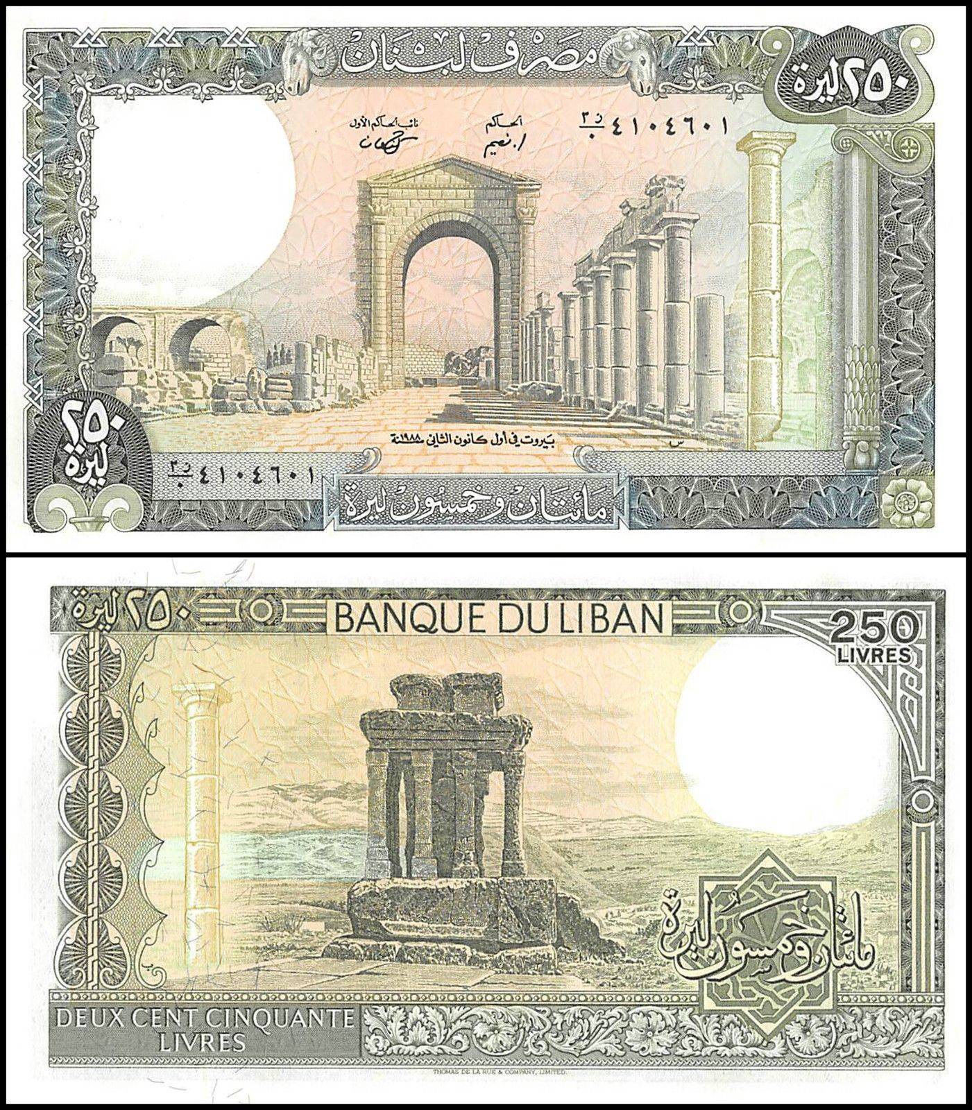 Lebanon 250 Livres banknote from 1988, has a pick number of P-67e.3, is in uncirculated (UNC) condition and features Ruins of a Necropolis, a Colonnade, the Triumphal Arch in Tyre, and Ram Heads.