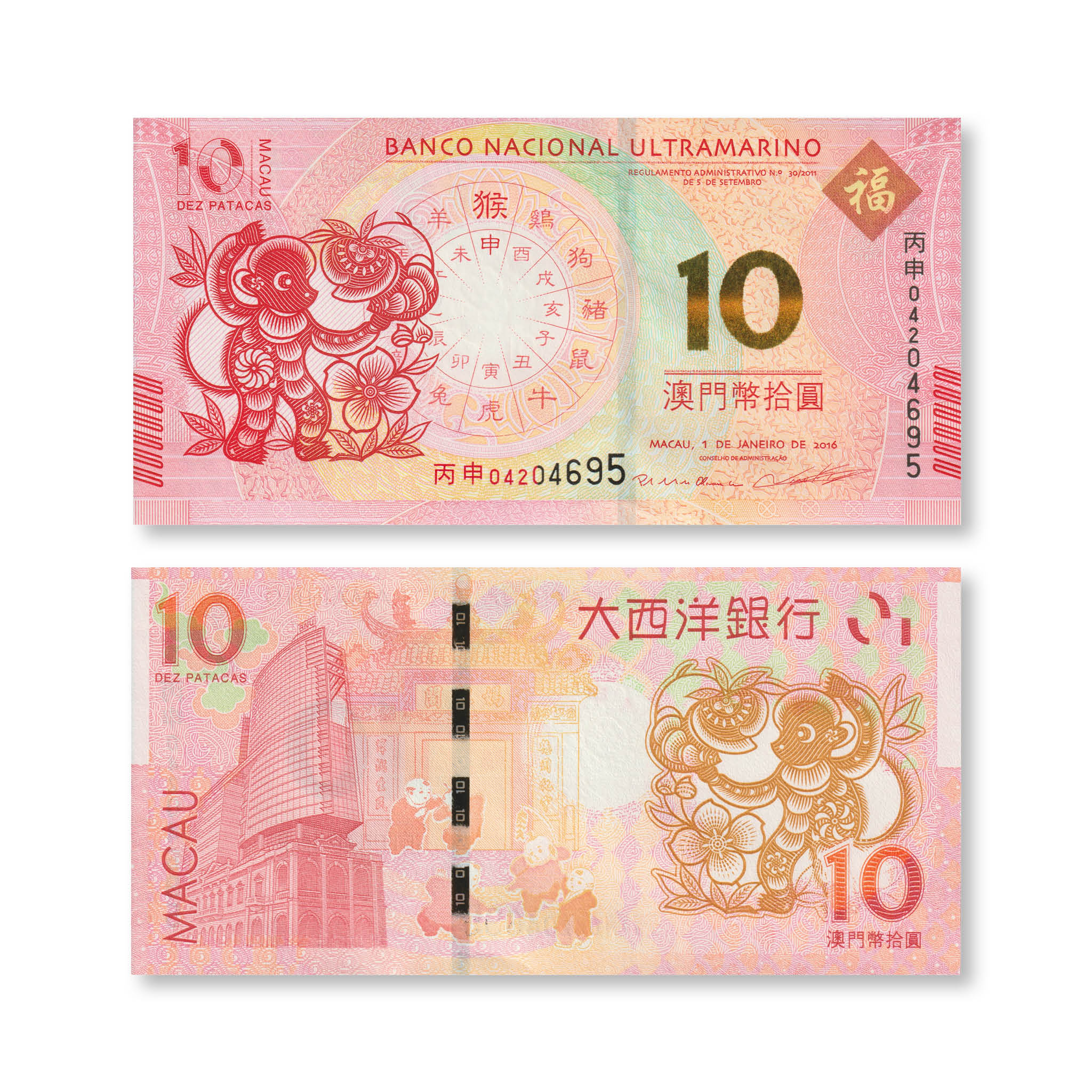 Macau 10 Patacas World Banknote 2016 Year of Monkey UNC Unique and Rare
