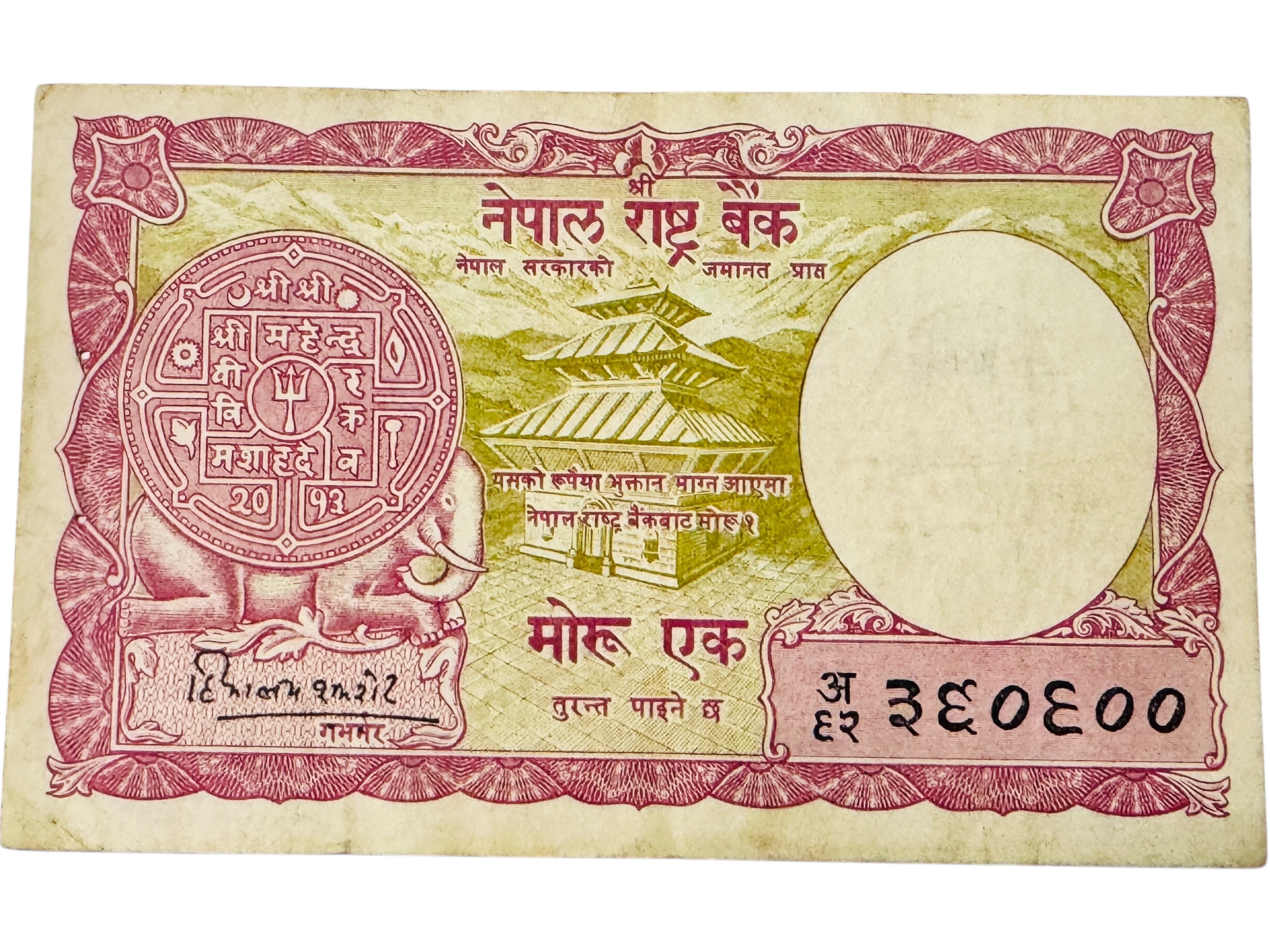 Nepal 1 Mohru P1 1968 Issue Banknote Elephant Hindu Temple Money Banknote Ultra Unique and Rare