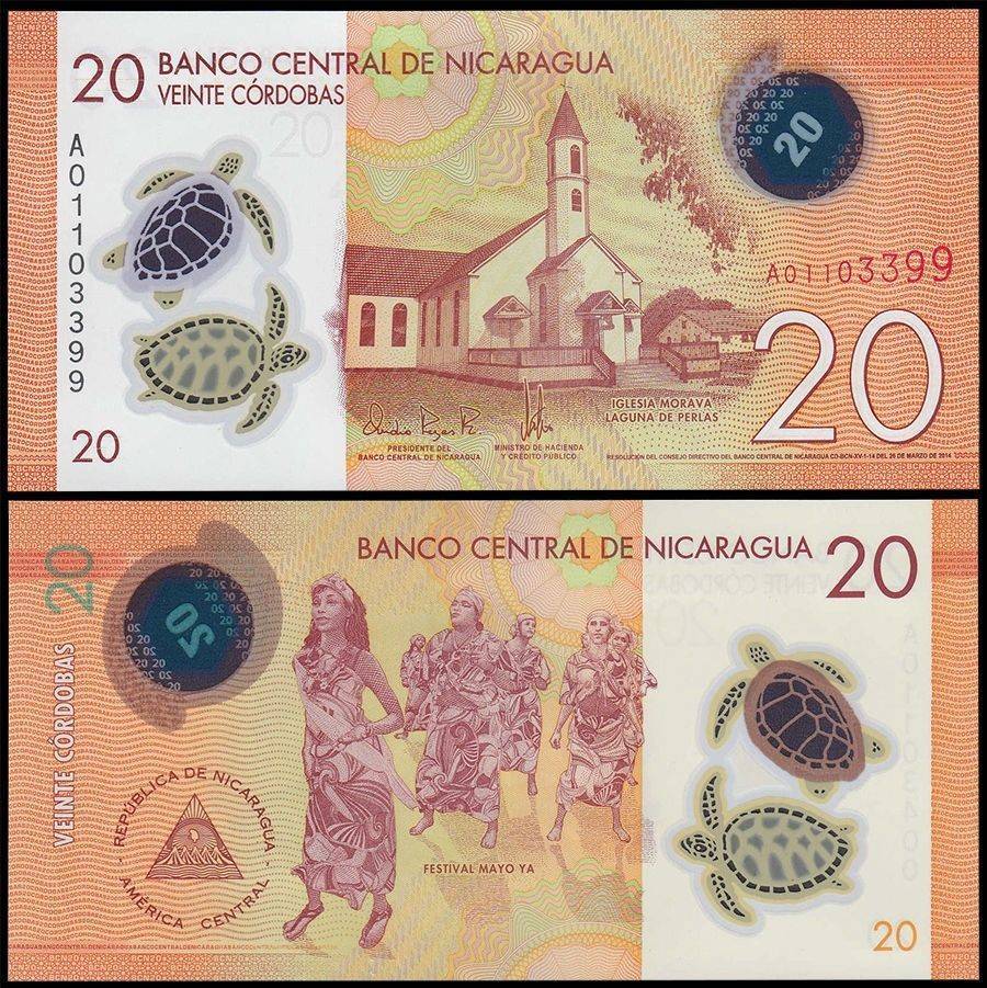 Nicaragua 20 Cordobas Banknote 2014 P210a1 UNC Polymer Unique and Rare