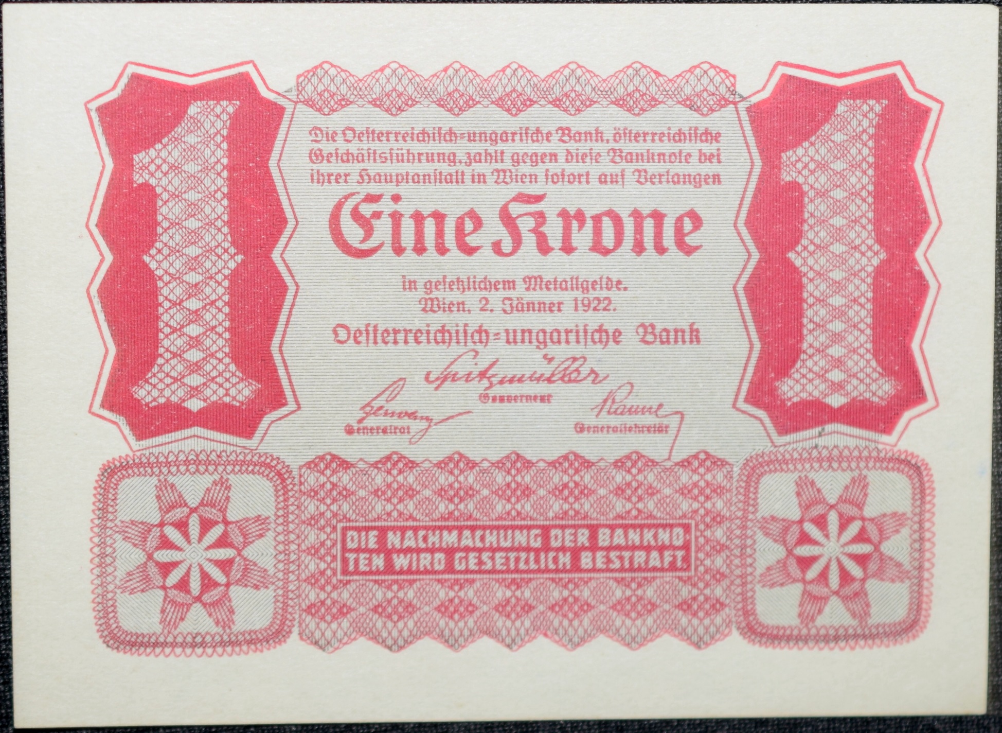 Austria Country, (AD 1922), 1 Krone, 1 Fine Krone, Wien, 2. Jänner 1922, Oeſterreichiſch-ungariſche Bank, DIE NACHMACHUNG DER BANKNO-TEN WIRD GESETZLICH BESTRAFT, Uniface UNC Grade, Rare.
