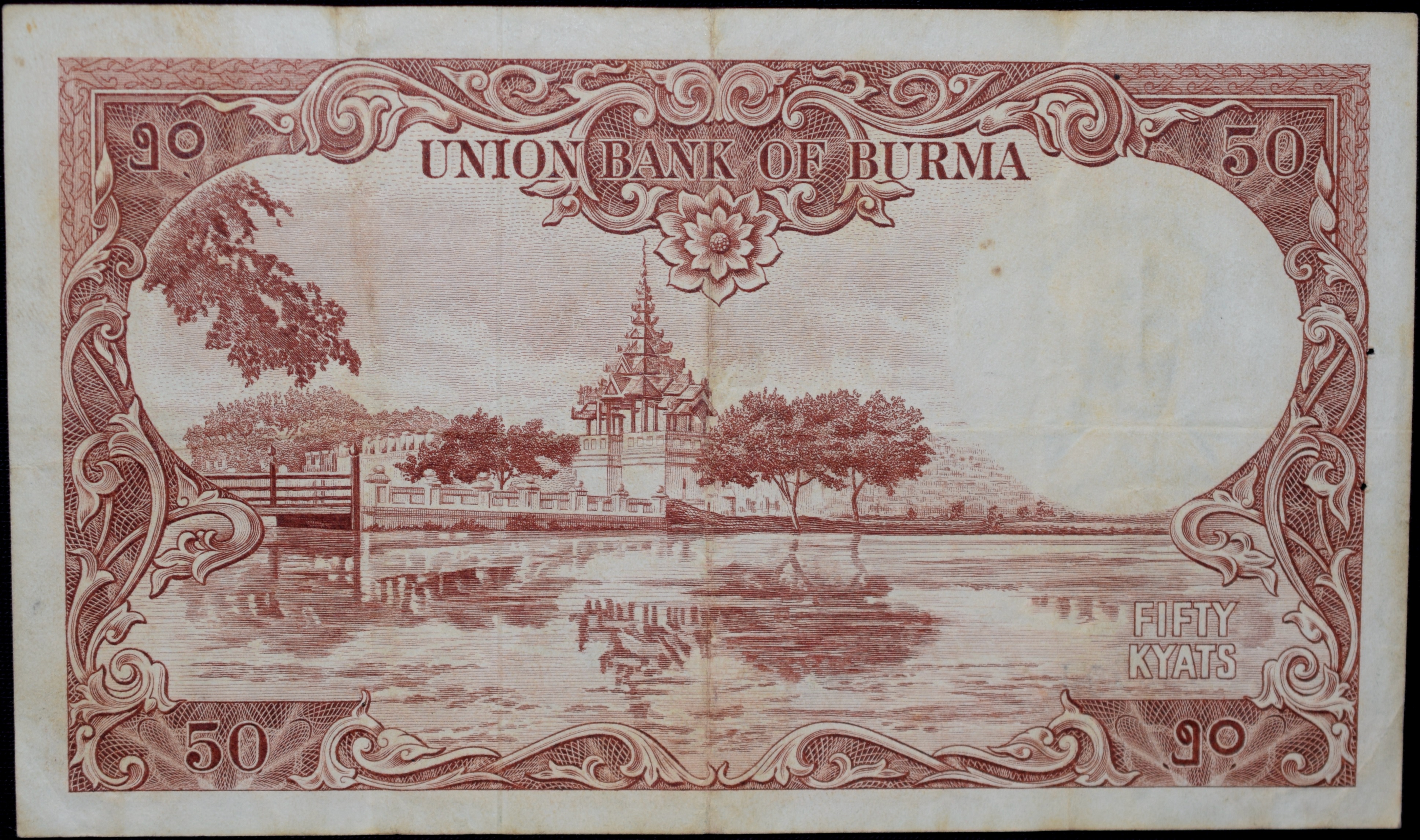 Old 50 Kyats of Burma Country (AD 1958) with Mandalay Palace Wall and moat
