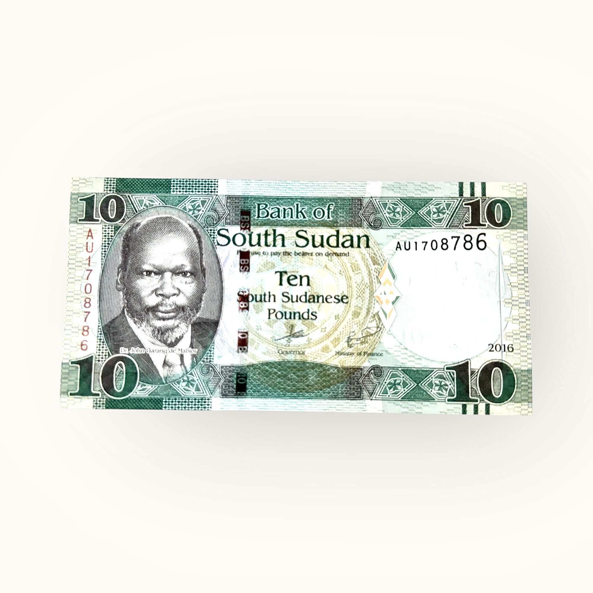 South Sudan 10 South Sudanese Pound banknote from 2016 with a pick number P-12b is in uncirculated (UNC) condition and features Dr. John Garang de Mabior.