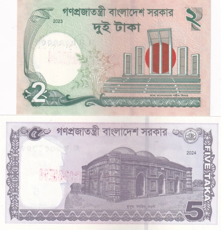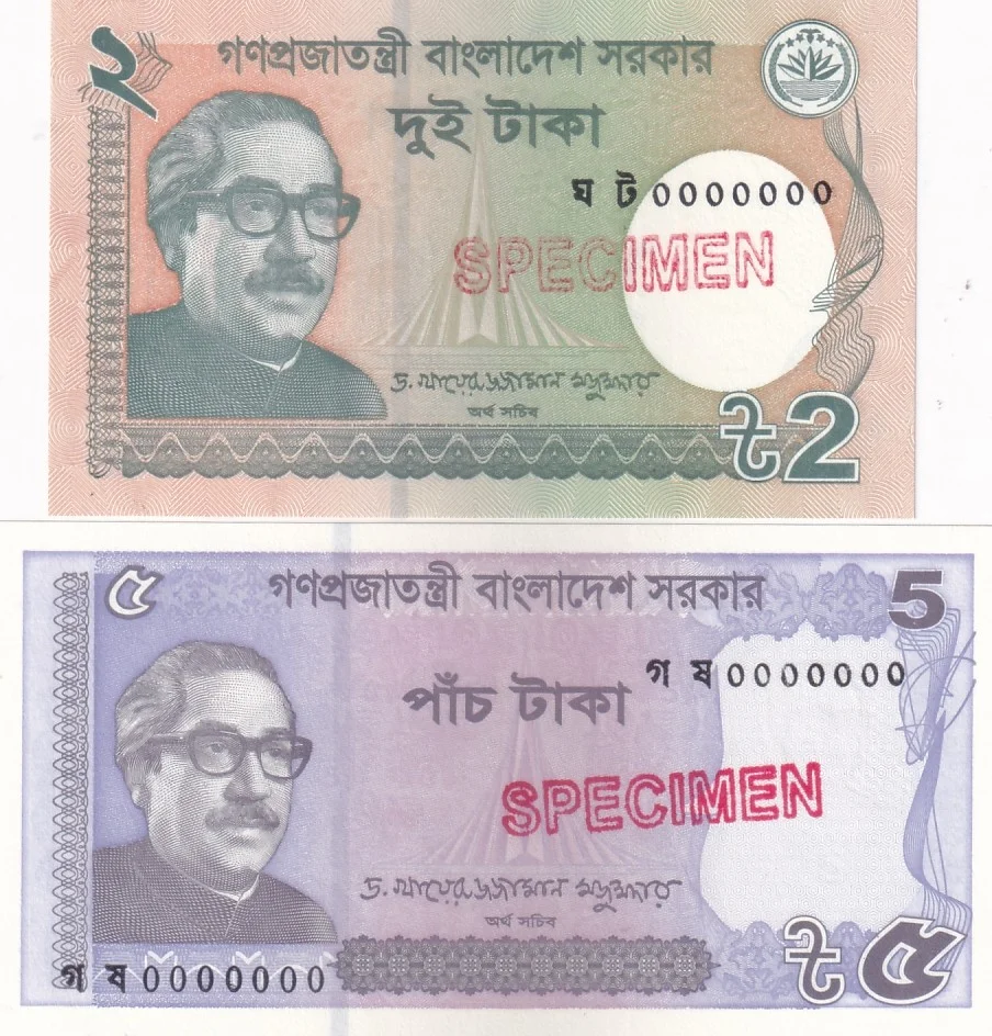 Specimen Two Unc Notes Set of Bangladesh 2 Taka 5 Taka Rare