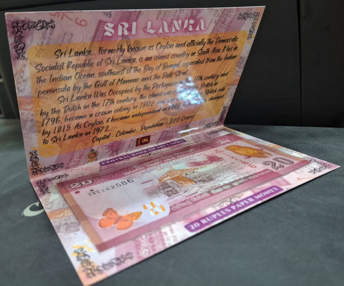 Indulge in the allure of this captivating SRI LANKA 20 RUPEES UNC Note encapsulated in stunning packaging. Issued by the Central Bank of Sri Lanka, this pristine 20 Rupee banknote boasts an uncirculated (UNC) condition, exuding a sense of novelty and crispness. The note features intricate designs and symbols reflective of Sri Lankan culture and heritage, making it a cherished piece for collectors and enthusiasts alike. Dating back to [year], this banknote holds historical significance, embodying a piece of Sri Lanka’s monetary history.