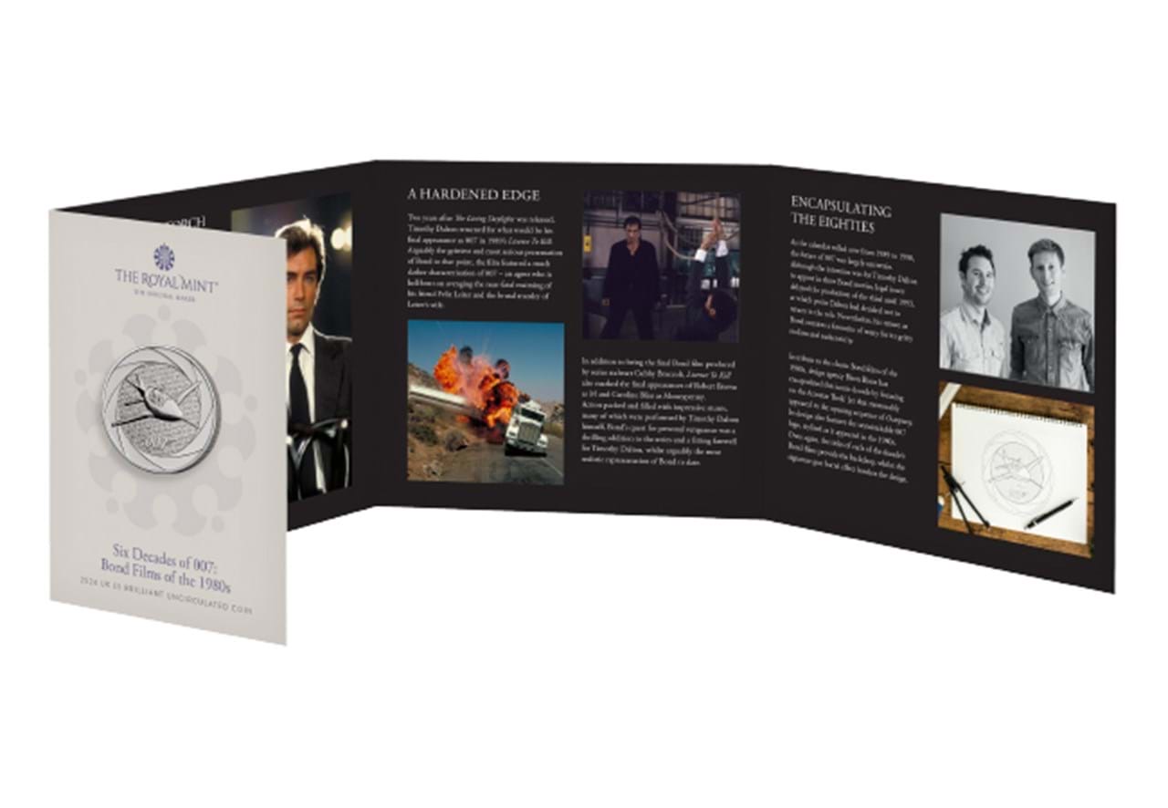 The UK 2024 Six Decades of 007: 1980s BU £5 Pack from the Royal Mint is a remarkable uncirculated set that pays homage to the iconic James Bond franchise. This limited edition collectible features a beautifully crafted £5 coin minted in BU (Brilliant Uncirculated) condition, showcasing the 1980s era of the Bond films. The coin is officially issued by the Royal Mint, renowned for its quality and craftsmanship.