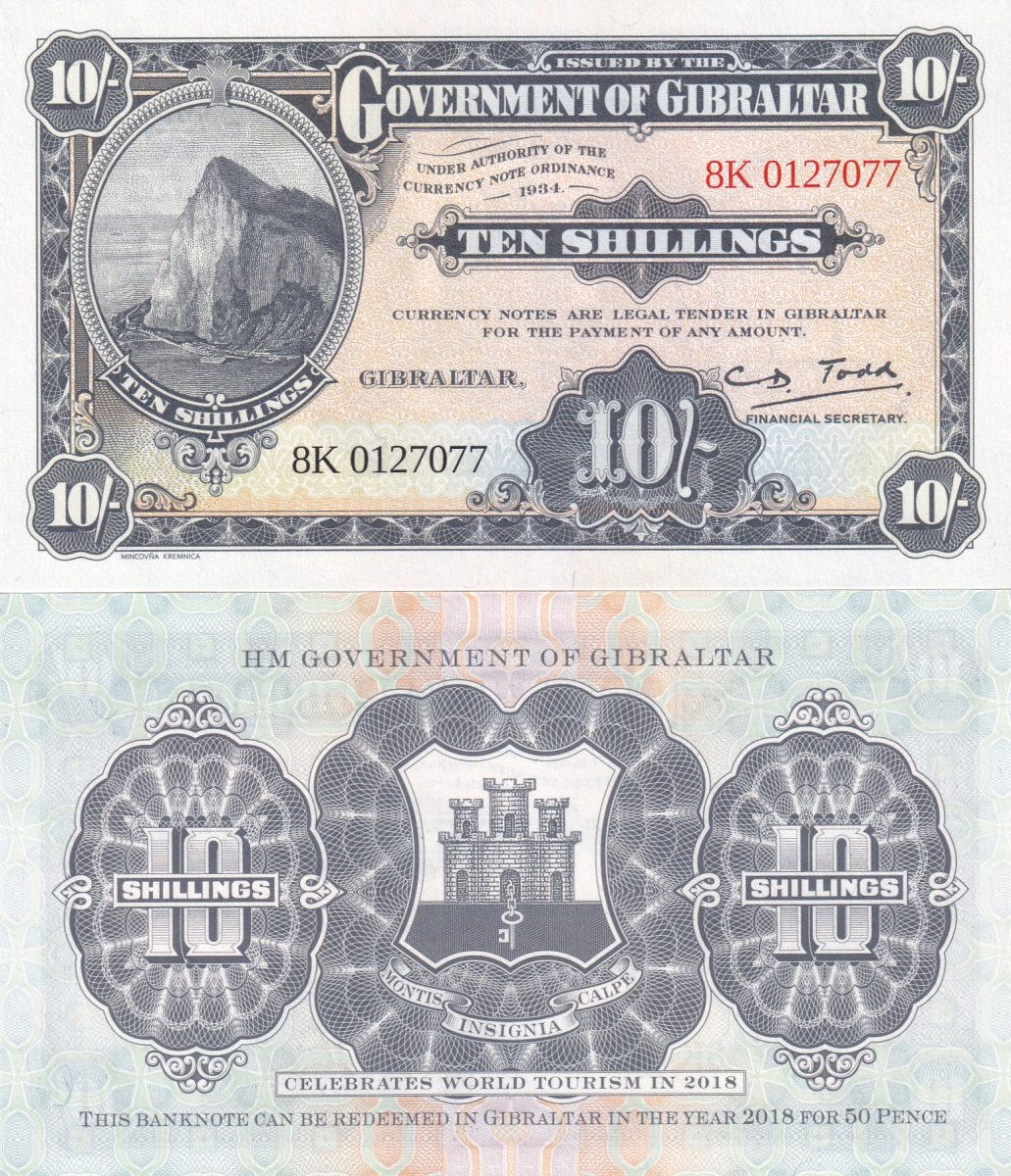 United Kingdom, Gibraltar 50 Pence / 10 Shillings World Tourism Year Commemorative issue RARE UNC 🤩NOTE