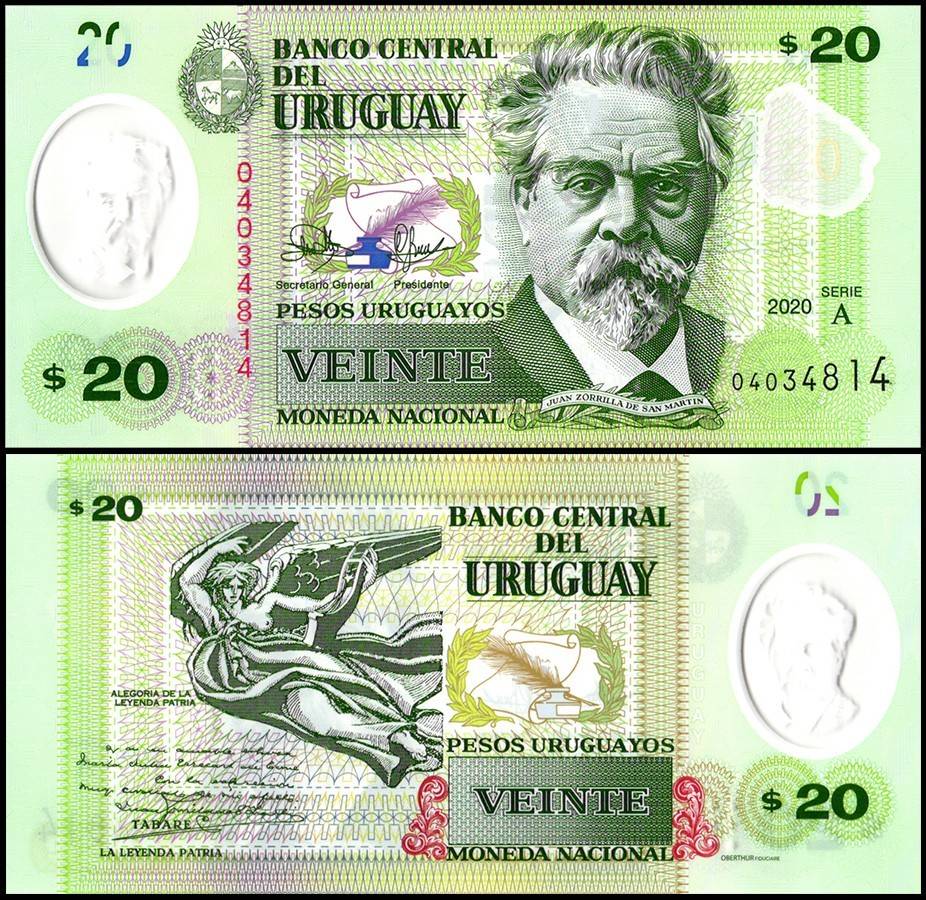 Uruguay 20 Pesos Uruguayos Banknote from 2020 with pick number P-101a.1 is in uncirculated (UNC) condition and features Juan Zorrilla de San Mart├нn. This note is printed on polymer.