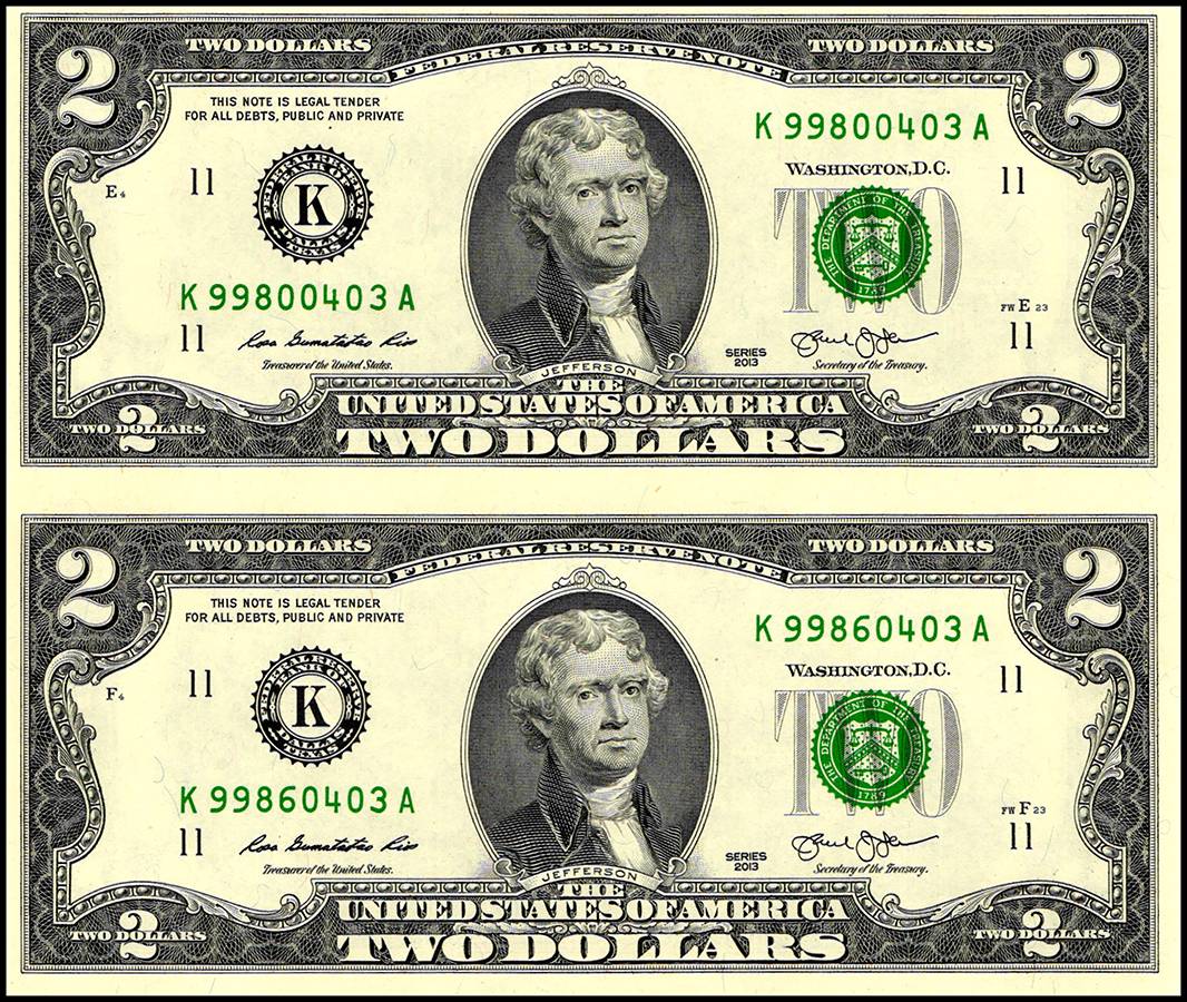 USA 2 Dollars Banknote 2013 Issue K Series Gem UNC 2 Notes UNCUT Sheet Very Unique and Ultra Rare