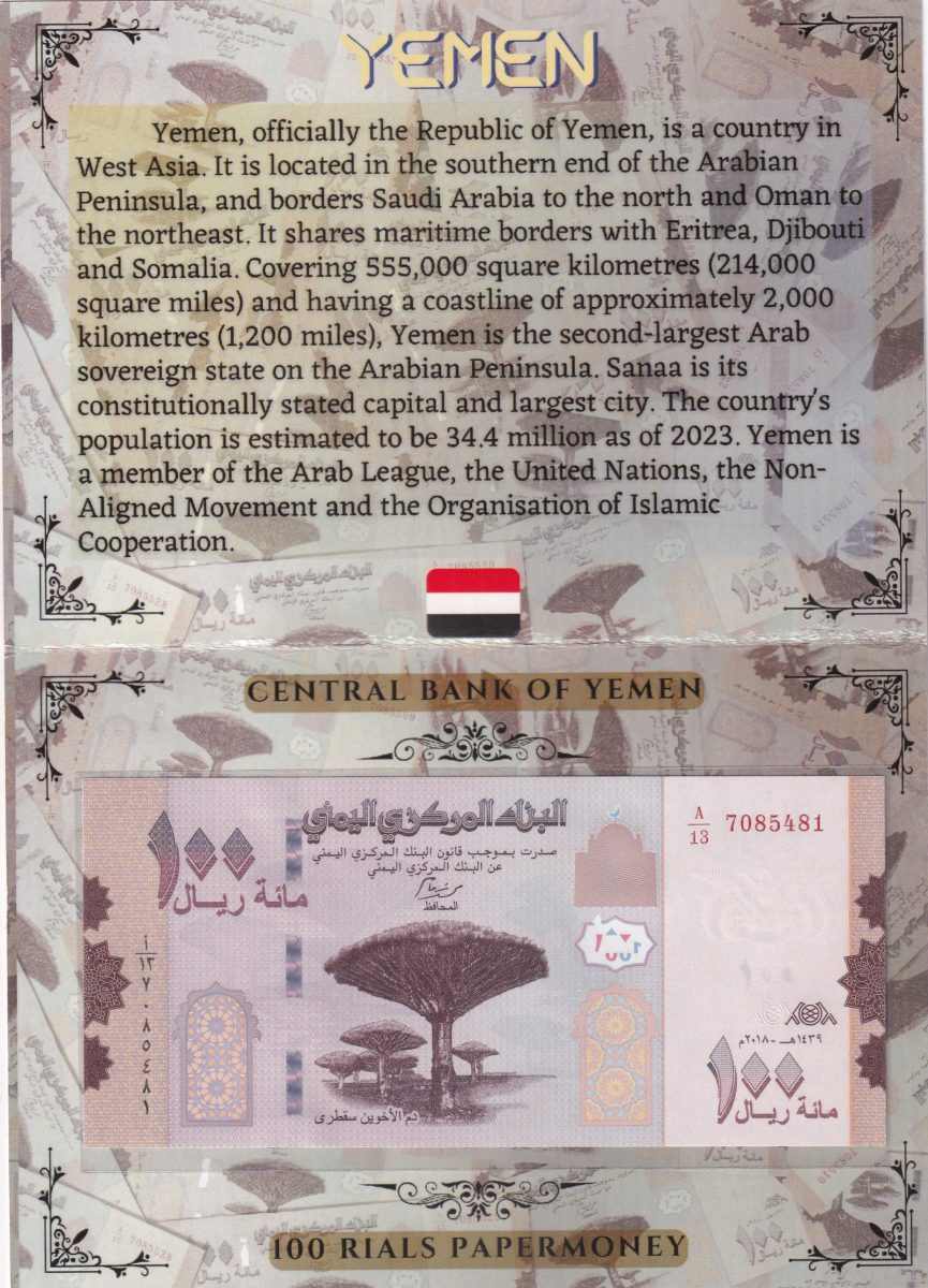 Indulge in the allure of rare collectibles with this exquisite Yemen 100 Rial UNC note encased in stunning packaging. Issued in pristine Uncirculated condition, this note boasts a fascinating history dating back to [year]. Bearing the denomination of 100 Rials, it showcases intricate designs and motifs reflective of Yemen’s rich cultural heritage. The issuing authority’s signature adds a touch of authenticity, making this piece a coveted addition to any collector’s ensemble.