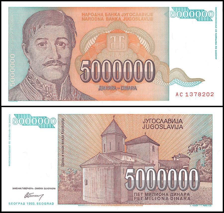 Yugoslavia 5 Million Dinara Banknote 1993 P132 UNC Unique and Rare