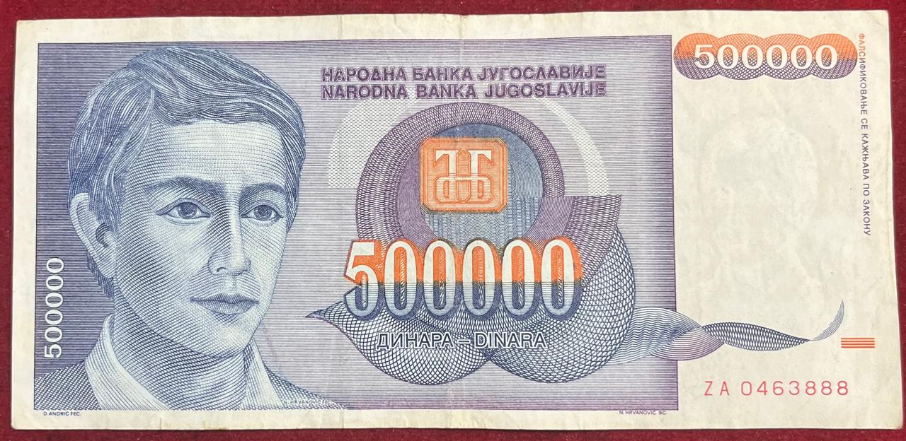 YUGOSLAVIA 500000 DINARA RARE NOTE #B-2