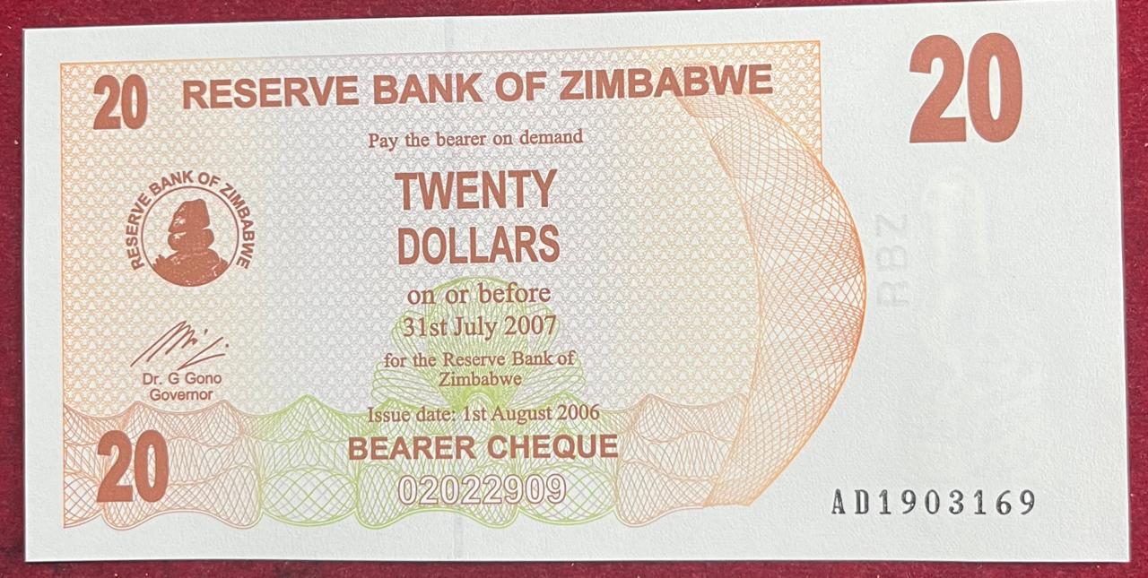 ZIMBABWE 20 DOLLARS UNC BANK NOTE