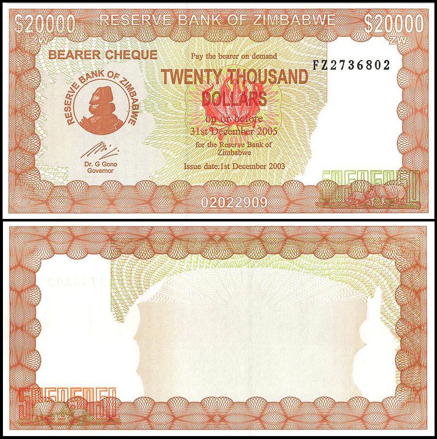 Zimbabwe 20000 Dollars Bearer Cheque 2003 P23f UNC Unique and Rare