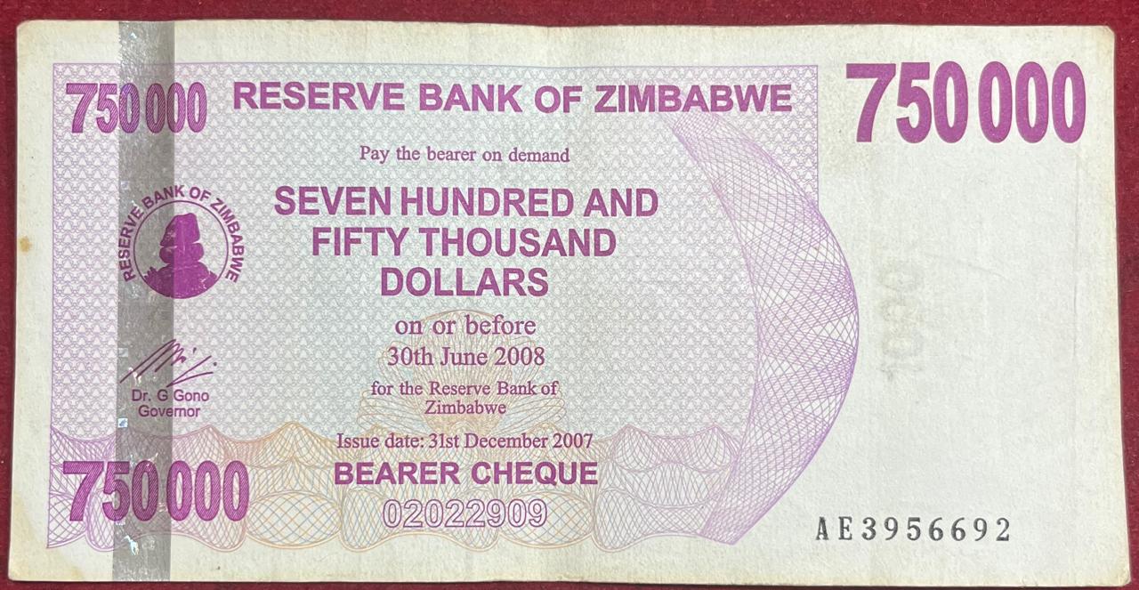ZIMBABWE 750000 DOLLARS RARE NOTE #B-2