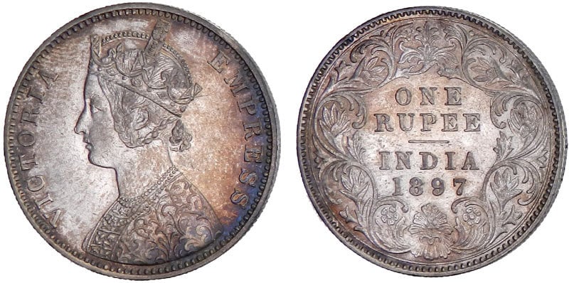 2. One Rupee 1897 – Minted in 1897, this coin is highly sought after. Made of silver metal, it weighs 11.66 grams and was minted by both Bombay and Calcutta mints. Adorned with Queen Victoria’s portrait, its rarity elevates its value to as high as 80,000 INR.