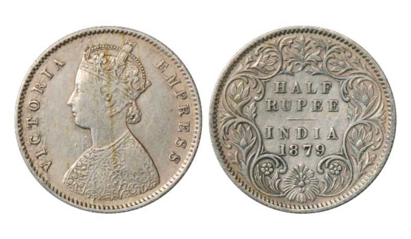 1. Half Rupee 1880 – This coin is exceptionally rare, crafted under the reign of Queen Victoria in 1880. Made of silver metal, it weighs around 6 grams. Scarcely found, its value in UNC condition can soar between 2,00,000 to 6,00,000 INR. With its rarity, its future value may well exceed even this estimate.